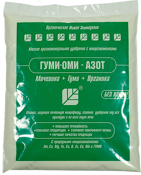 Мягкое органоминеральное удобрение ГУМИ-ОМИ-АЗОТ (без хлора) - микробиологически ферментированное органическое удобрение + мочевина + эликсир плодородия ГУМИ с природными микроэлементами Mn, Ca, Mg, Fe, Cu, B, Zn, Co, Mo и др.